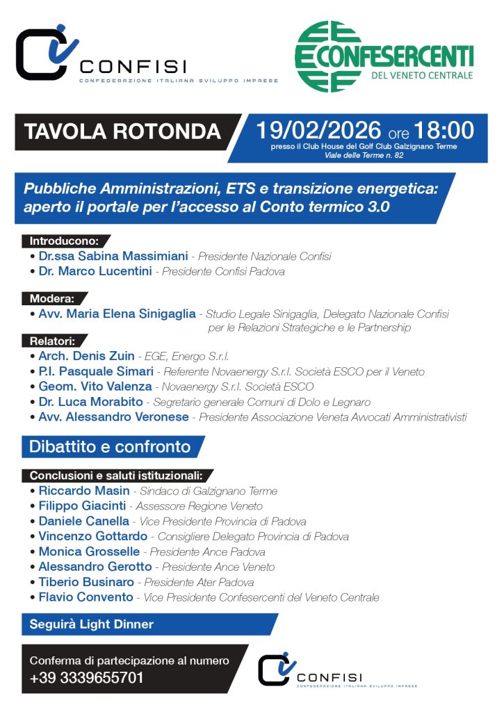 Si terrà giovedì 19 febbraio, dalle ore 18, la Tavola Rotonda dedicata alle novità del Conto Termico 3.0 e alle concrete possibilità di accesso agli incentivi per Pubbliche Amministrazioni ed Enti del Terzo Settore. L’iniziativa, organizzata in collaborazione da Confisi e Confesercenti del Veneto Centrale si terrà nella Club House del Golf Club Galzignano Terme (Viale delle Terme n. 82)